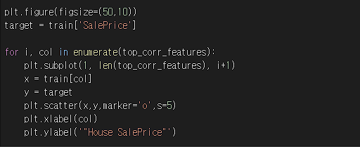 해당 지표들와 주택 가격에 대한 선형성을 파악하기 위해서 그림을 그려서 분석해줬다.