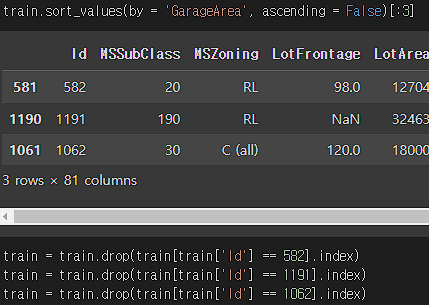 그리고 GarageArea 항목에서 Outlier도 처리해준다 (오른쪽에서 두번째, 큰 거 3개를 처리)