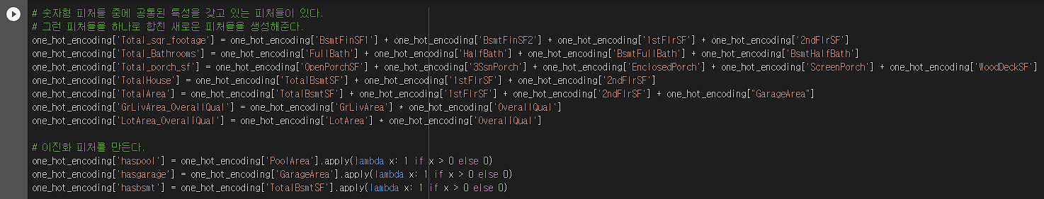 비슷한, 공통된 특성을 갖는 특성들을 합쳐준다. 예를 들면, 지하실 면적 = 지하1층 면적 + 지하2층 면적 뭐 이런식으로?