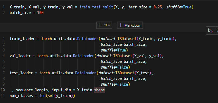 test를 위해 solit도 한다. 그리고 아까 구성한 DataLoader를 활용해 데이터를 구분한다.