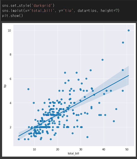 정말 많이썼던 Implot. 회귀선을 줘서 모델 평가하기 딱 좋았던 기억이 잇다.