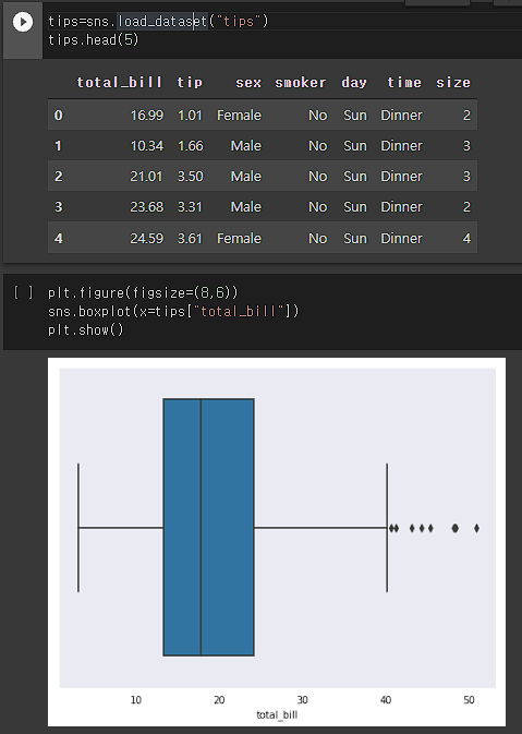여기서 맨 앞에 import가 빠졌는데, import seaborn as sns로 불러오면 된다. 불러온 데이터셋은 빌지와 팁 관련 데이터